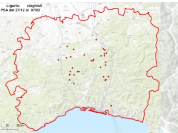Nella mappa i punti colorati indicano il luogo di ritrovamento degli animali positivi per peste suina africana.