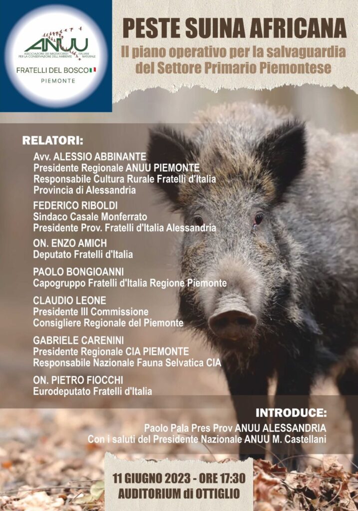 Anuu Migratoristi Piemonte organizza un convegno dal titolo “Peste suina africana – Il piano operativo per la salvaguardia del Settore Primario piemontese”, che si svolgerà domenica 11 giugno prossimo alle ore 17:30 nell’Auditorium di Ottiglio (AL). L’obiettivo è presentare le modifiche al piano di azione studiate insieme a Cia Alessandria, già presentate all’incontro svolto con il Commissario locale Giorgio Sapino.
