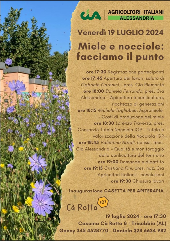 Gli interventi previsti sono di Gabriele Carenini – presidente regionale Cia Piemonte, Daniela Ferrando – presidente provinciale Cia (Apicoltura e corilicoltura, ricchezza di generazioni), Michele Tagliabue – Aspromiele (Costi di produzione del miele), Lorenzo Traversa – presidente Consorzio Tutela Nocciola IGP (Tutela e valorizzazione della nocciola IGP), Valentina Natali – consulente tecnico Cia Alessandria (Qualità e monitoraggio della corilicoltura del territorio), Cristiano Fini – presidente nazionale Cia, che chiuderà i lavori.