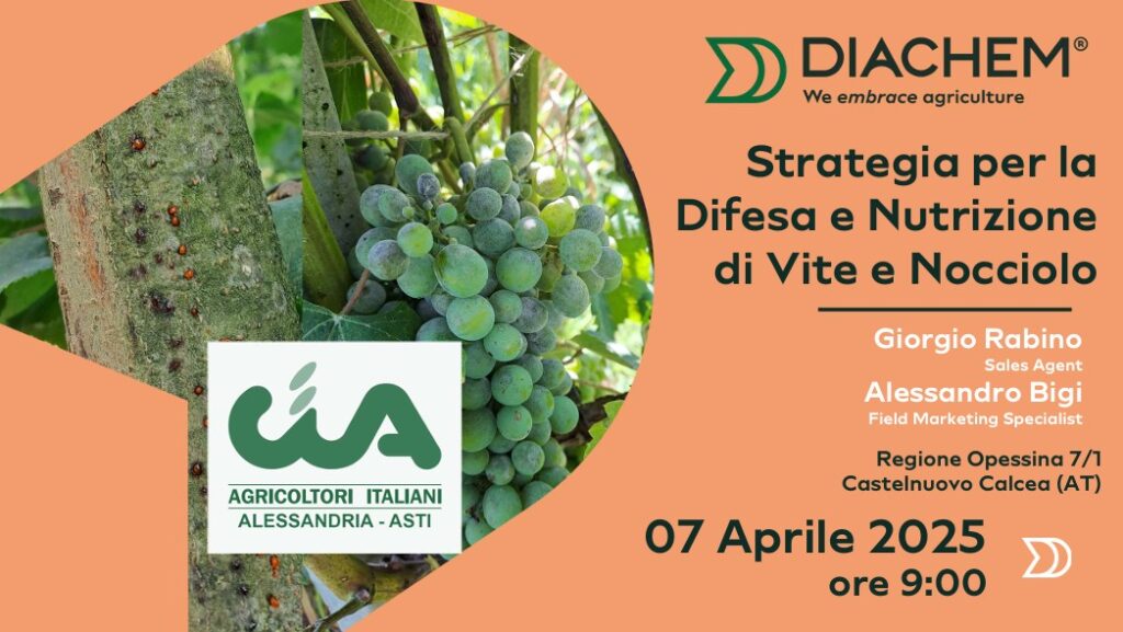 Dopo l’interesse riscontrato all’incontro nella sede interprovinciale di Alessandria, Cia Alessandria-Asti replica la giornata di informazione con Diachem, dedicata alle strategie di difesa e nutrizione di vite e nocciolo. Saranno nuovamente presenti Giorgio Rabino (sales agent) e Alessandro Bigi (Field Marketing Specialist) di Diachem. Per info e adesioni chiedere al tecnico Cia di riferimento o a Valentina Natali – v.natali@cia.it. L’appuntamento è lunedì 7 aprile dalle ore 9 nella sede Cia di Castelnuovo Calcea.