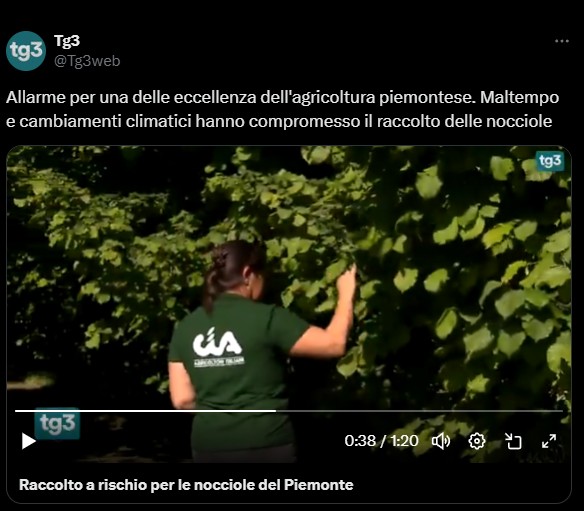 Anche il TG 3 Rai si è occupato a livello nazionale della situazione di crisi che colpisce il comparto corilicolo, di cui le province di Alessandria-Asti sono leader. Nel servizio, visibile cliccando qui, ci sono le interviste alla presidente Cia Alessandria-Asti Daniela Ferrando di Trisobbio e al socio Cia Alessandro Durando di Portacomaro.