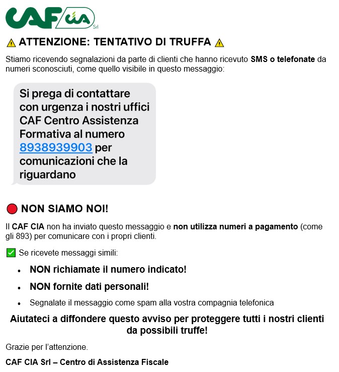 Cia informa che stiamo ricevendo segnalazioni da parte di clienti che hanno ricevuto SMS o telefonate da numeri sconosciuti, come l’immagine sotto riportata. Il CAF CIA non ha inviato questo messaggio e non utilizza numeri a pagamento (come gli 893) per comunicare con i propri clienti. Se ricevete messaggi simili: NON richiamate il numero e NON fornite dati personali, poi segnalate come spam sul vostro telefono. In caso di dubbio, chiamate i numeri abituali di riferimento Cia.
