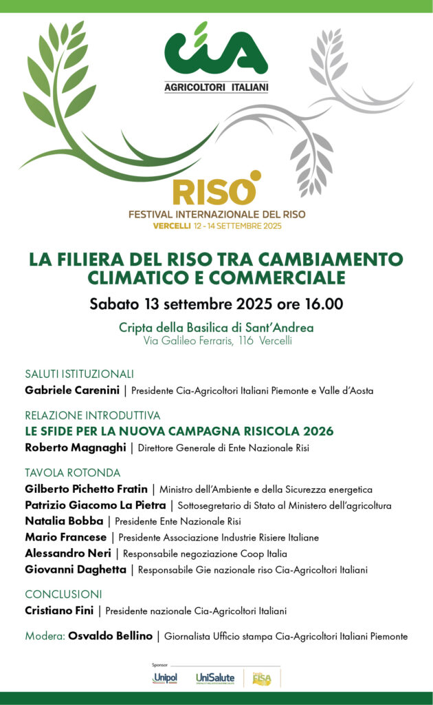- Sabato 13 settembre 2025 ore 16.00 Cripta della Basilica di Sant’Andrea | Vercelli: Convegno promosso da Cia-Agricoltori Italiani “La filiera del riso tra cambiamento climatico e commerciale”.